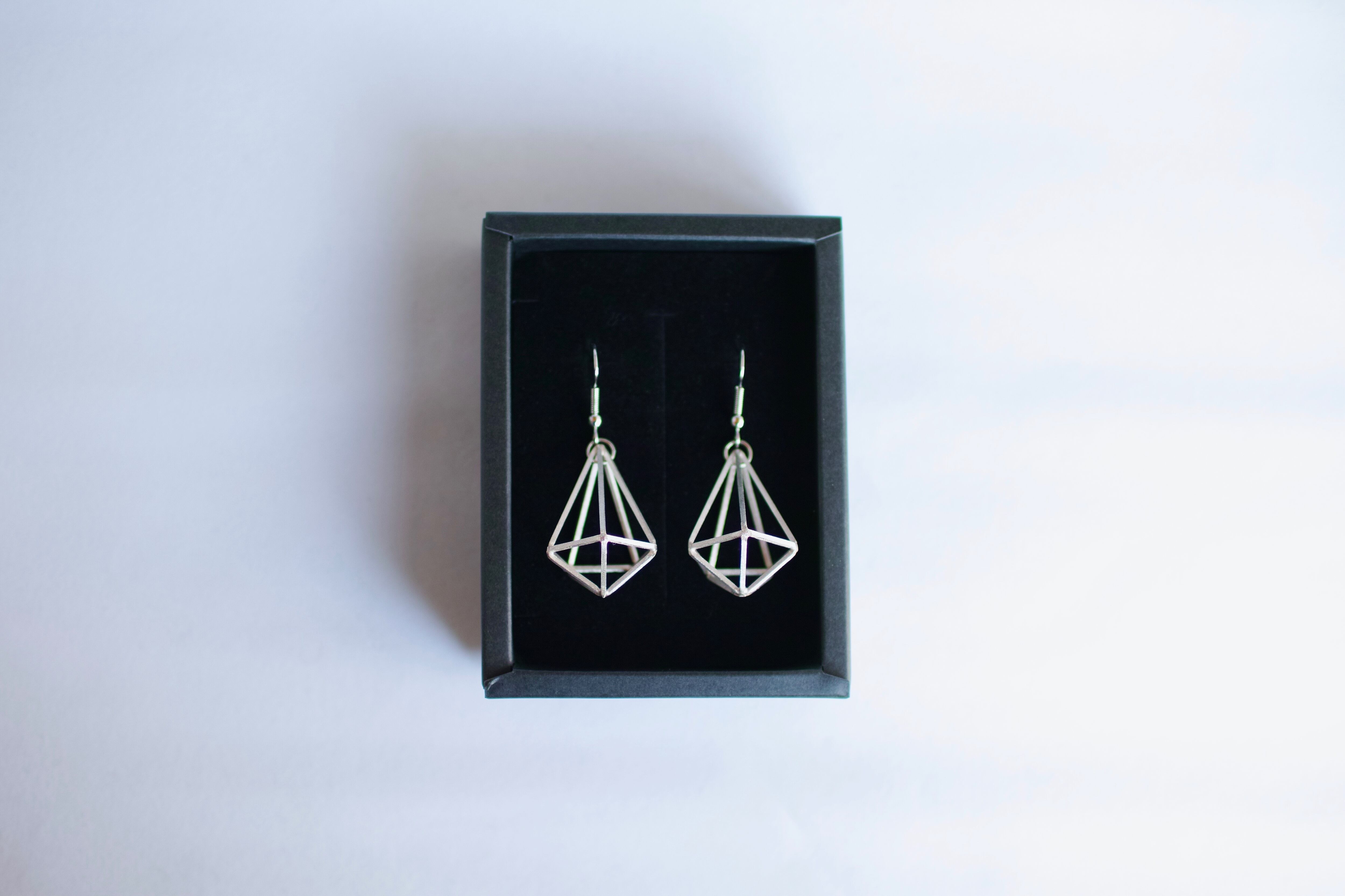 ロウ付けという彫金技法を用いて,1点1点金属線から切り出して手製作したピアス(イヤリング)です。