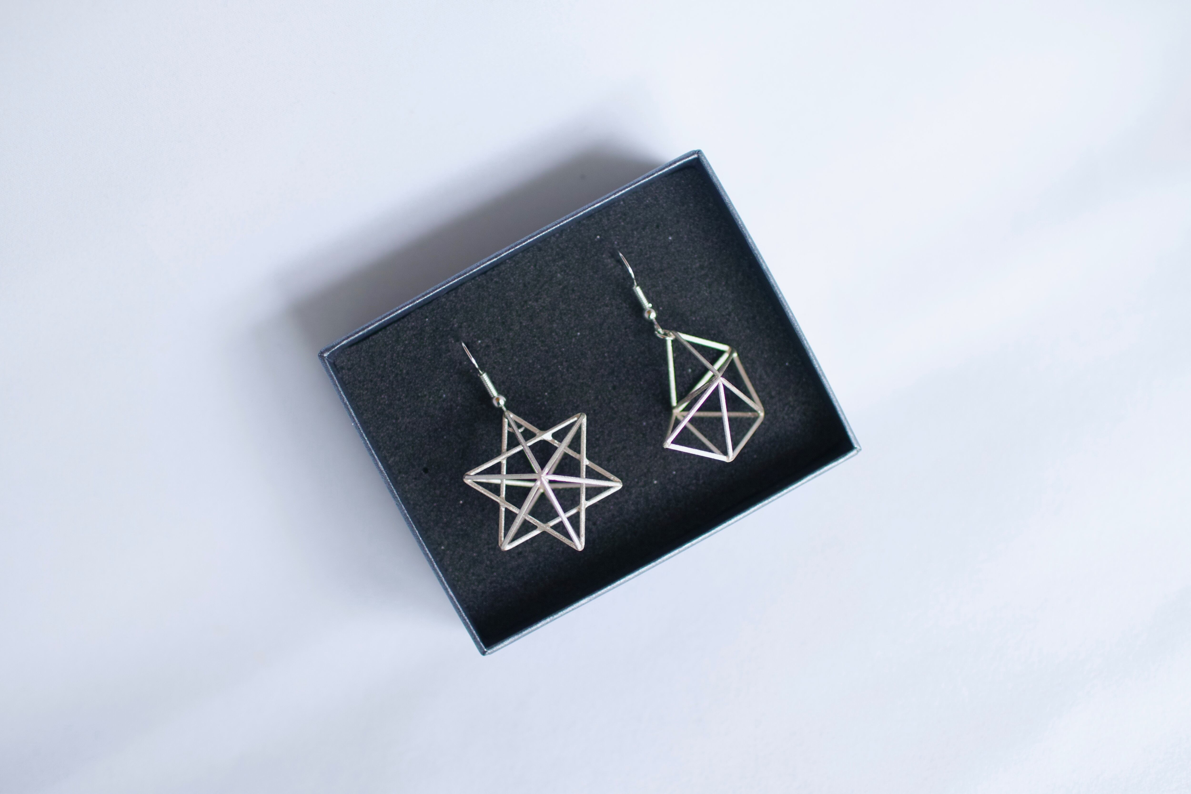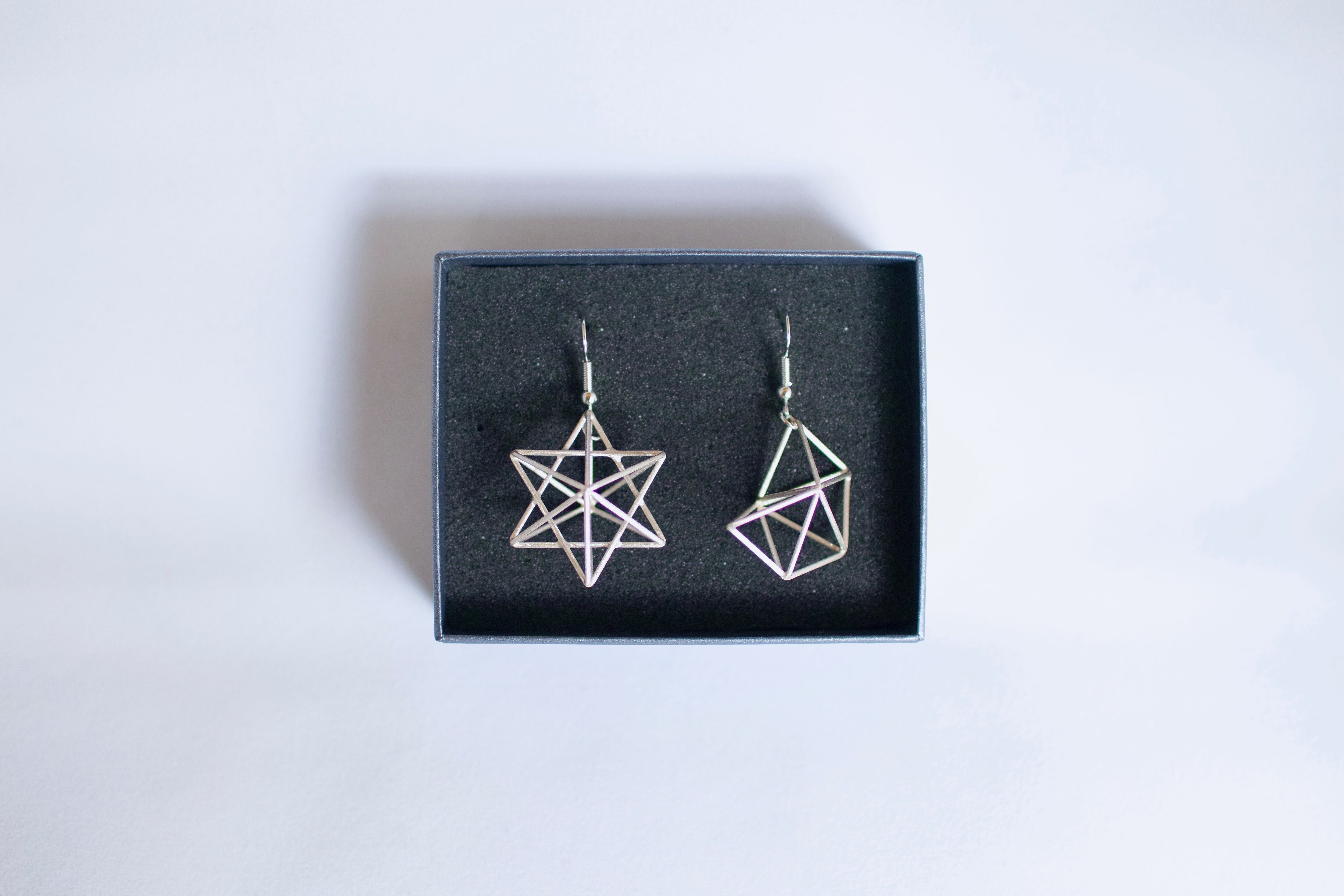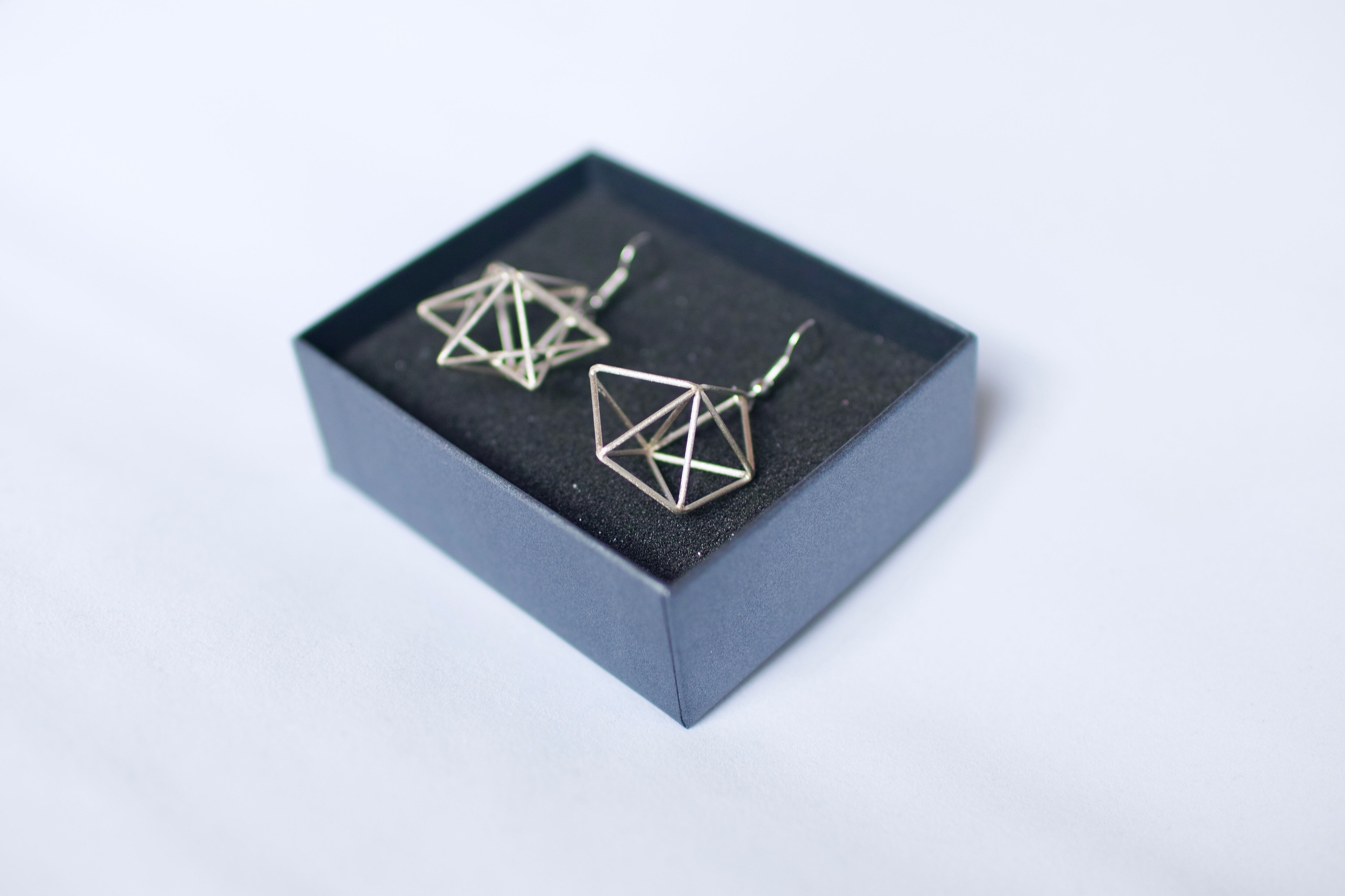ロウ付けという彫金技法を用いて,1点1点金属線から切り出して手製作したピアス(イヤリング)です。