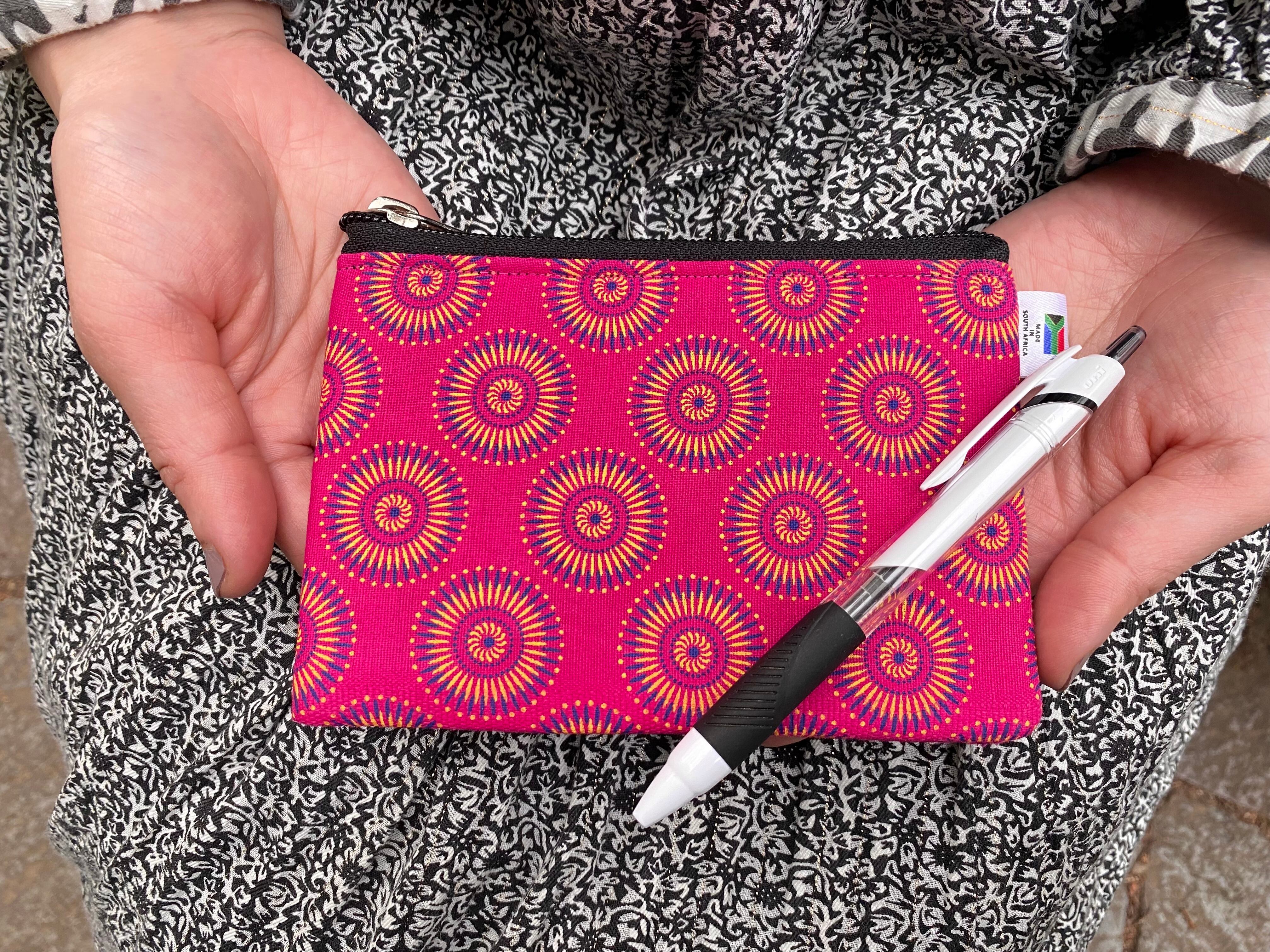コンパクトで使い勝手の良いポーチです。ペンケースにはギリギリ使えそうですが、ハサミやホッチキスなども入れるには小さいです。サニタリーケースやティッシュケース、パスポートケースなどにご利用ください。