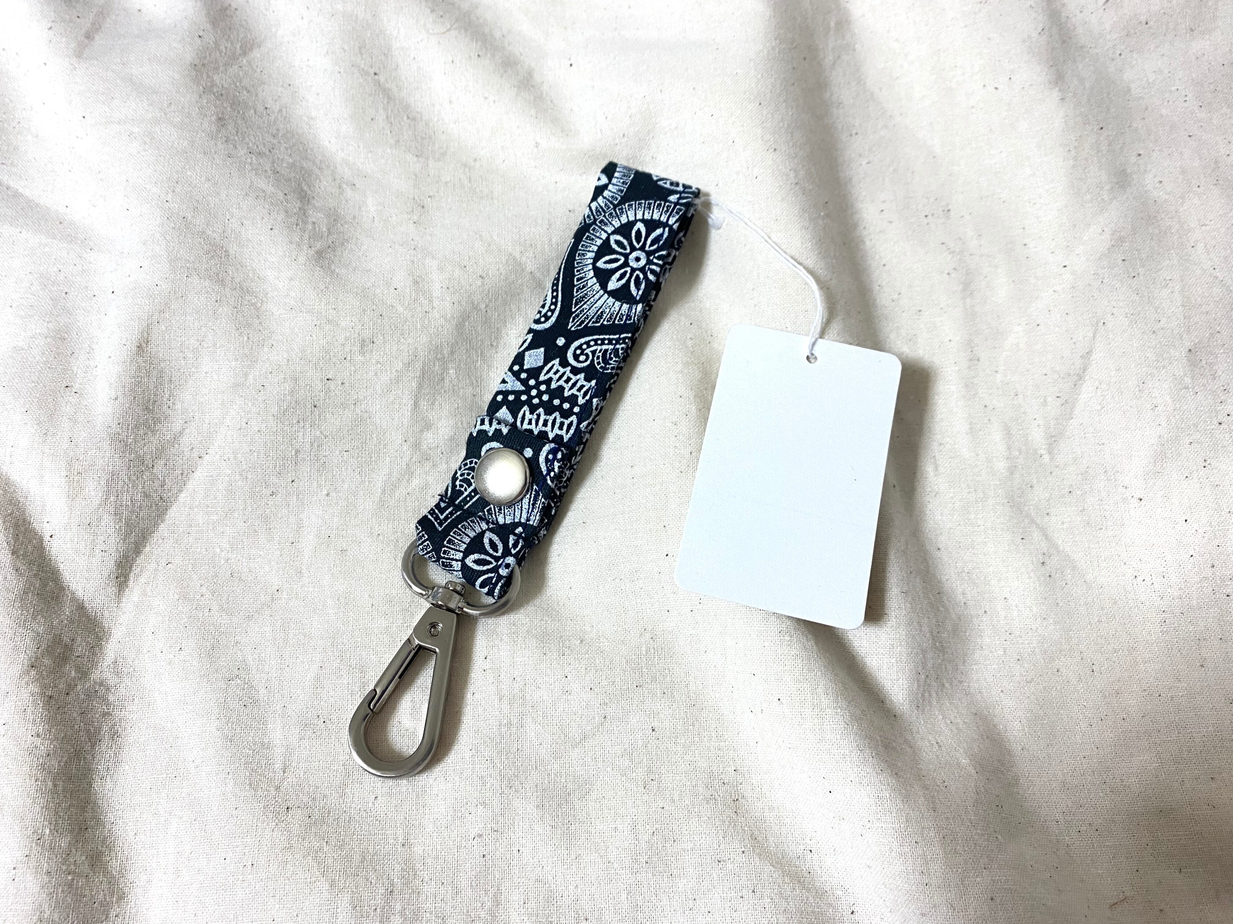 アフリカ布製のキーストラップです。幅約2cmの生地をくるっと折り返したような形で、スナップボタンは開けてカバンなどに取り付けることができす。