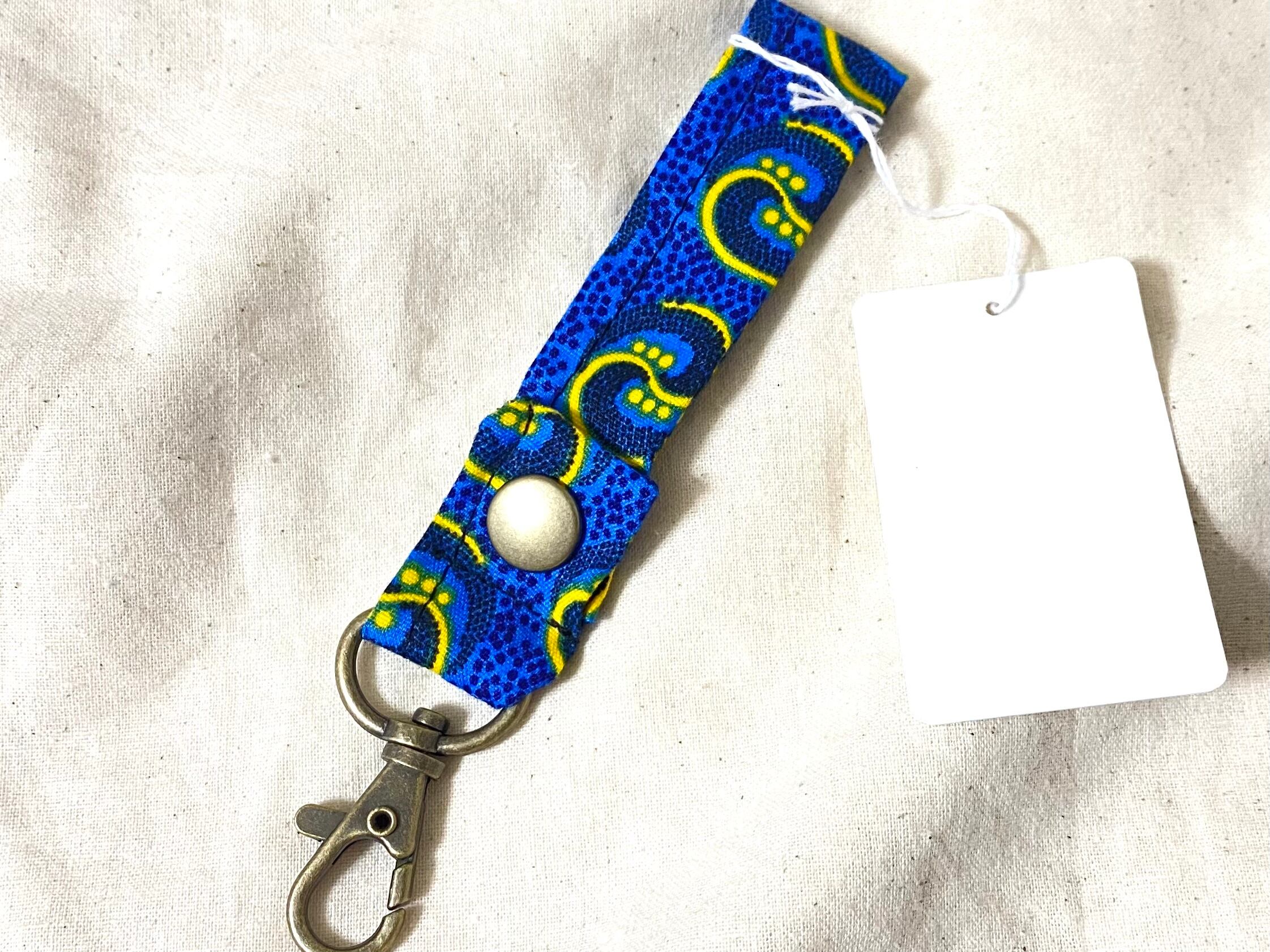 アフリカ布製のキーストラップです。幅約2cmの生地をくるっと折り返したような形で、スナップボタンは開けてカバンなどに取り付けることができす。