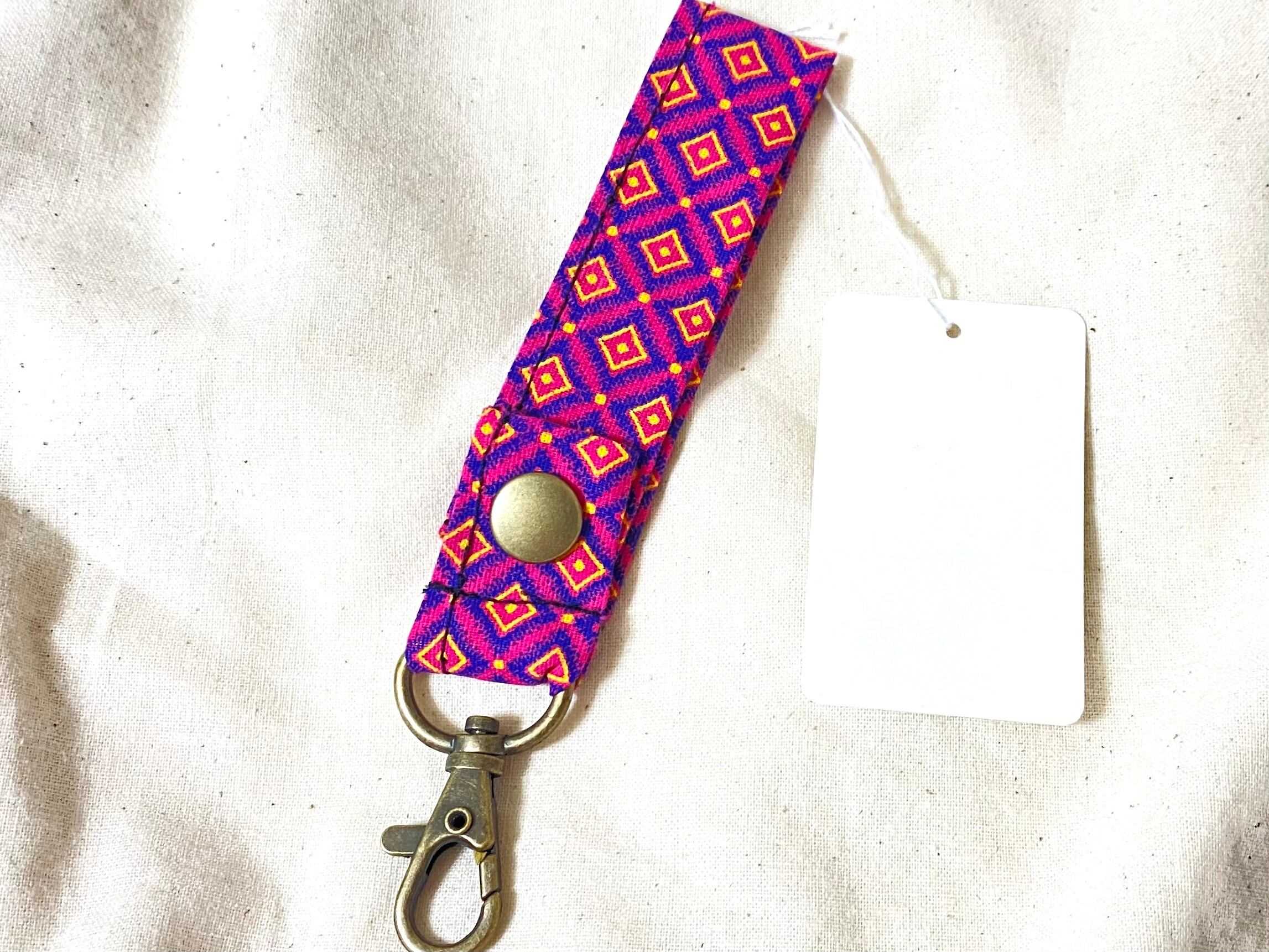 アフリカ布製のキーストラップです。幅約2cmの生地をくるっと折り返したような形で、スナップボタンは開けてカバンなどに取り付けることができす。