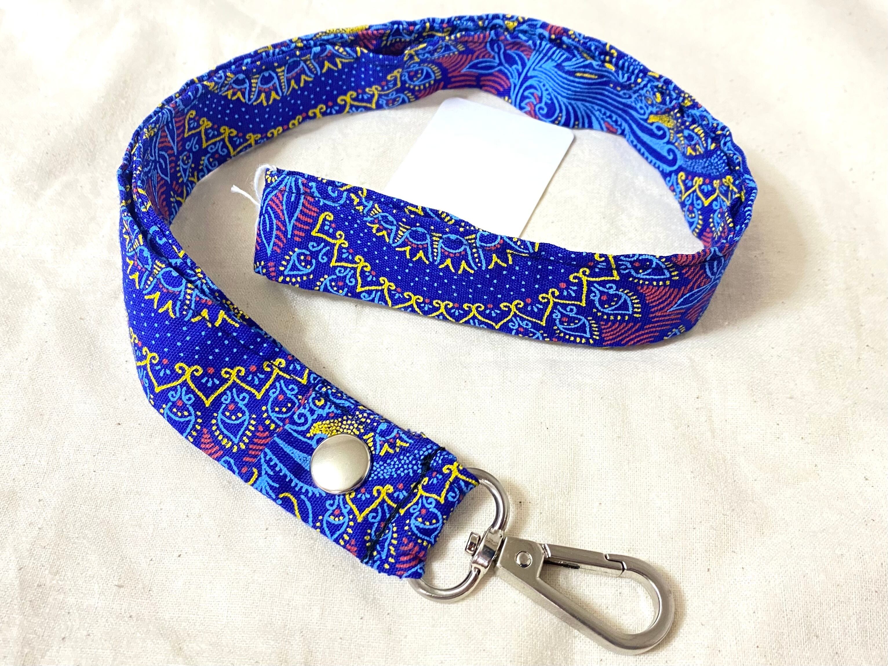 アフリカ布製のネックストラップです。幅約2cmの生地をくるっと折り返したような形で、鍵やカードホルダー、スマートフォンなど重量のあるもの、落としてはいけないものを取り付ける場合を考慮してスナップボタンは固定式で開閉できない作りになっています。
