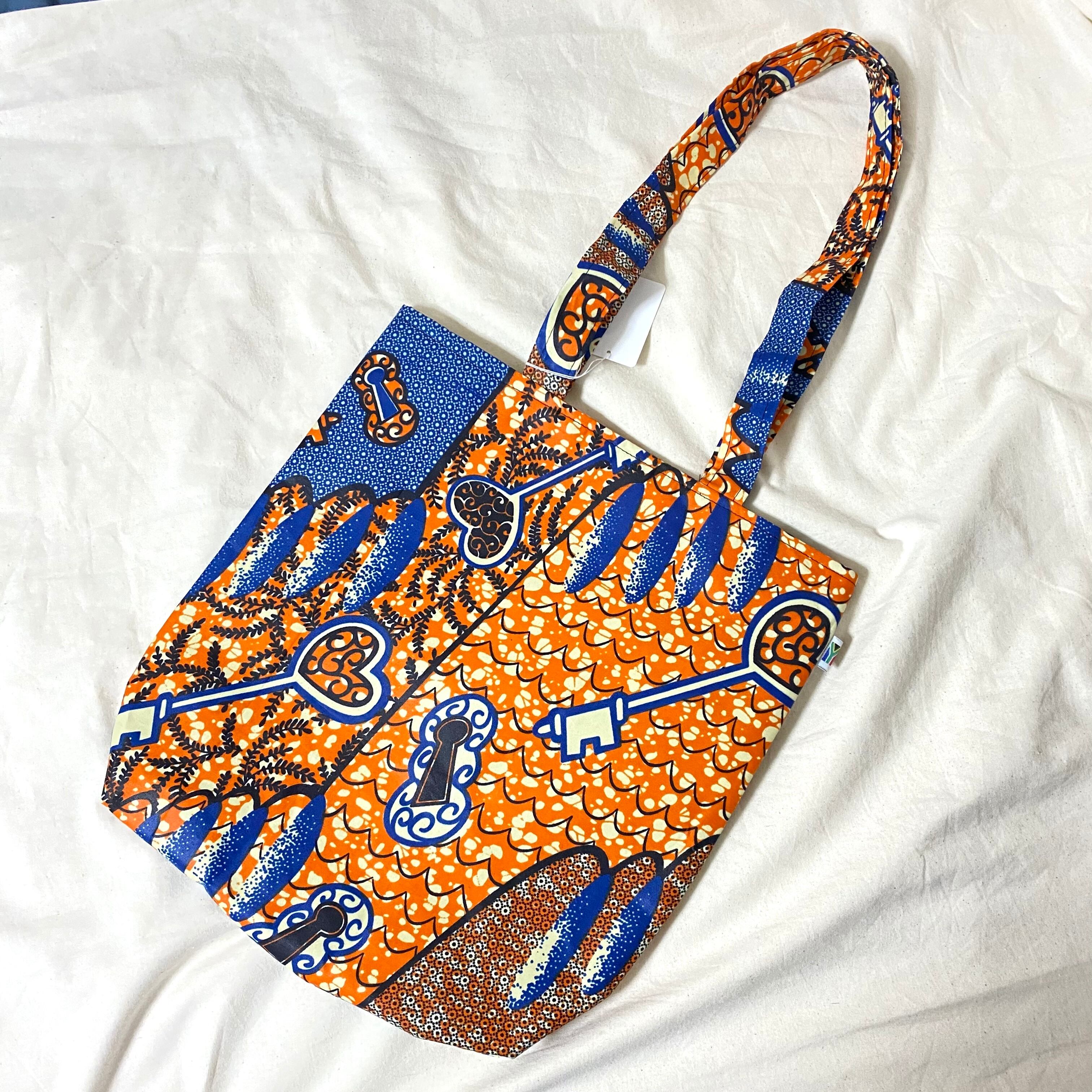 アフリカ布製のトートバッグです。バッグ部分はA4サイズが入る大きさ、持ち手部分は肩掛けできる長さで使い勝手の良い設計です。