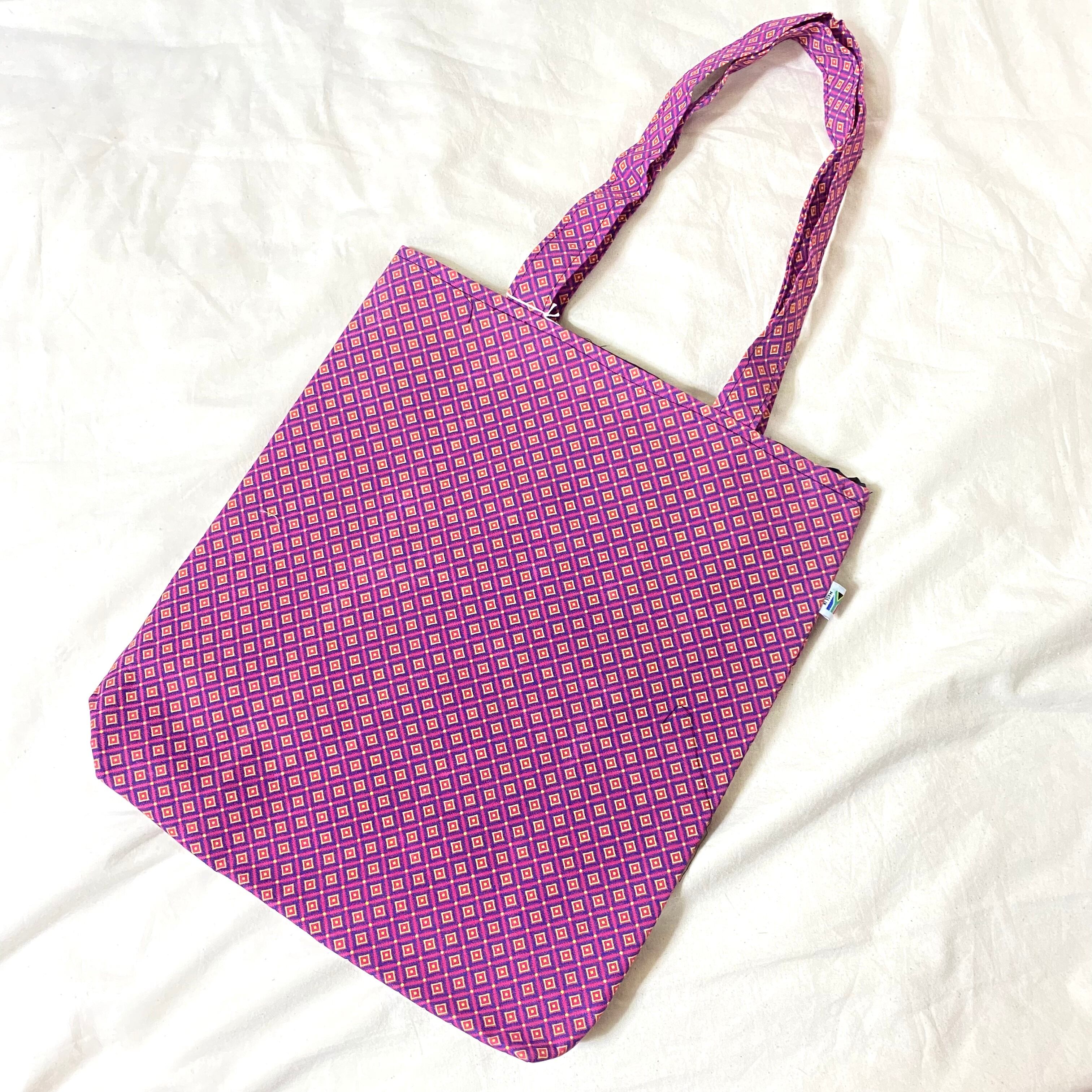 アフリカ布製のトートバッグです。バッグ部分はA4サイズが入る大きさ、持ち手部分は肩掛けできる長さで使い勝手の良い設計です。