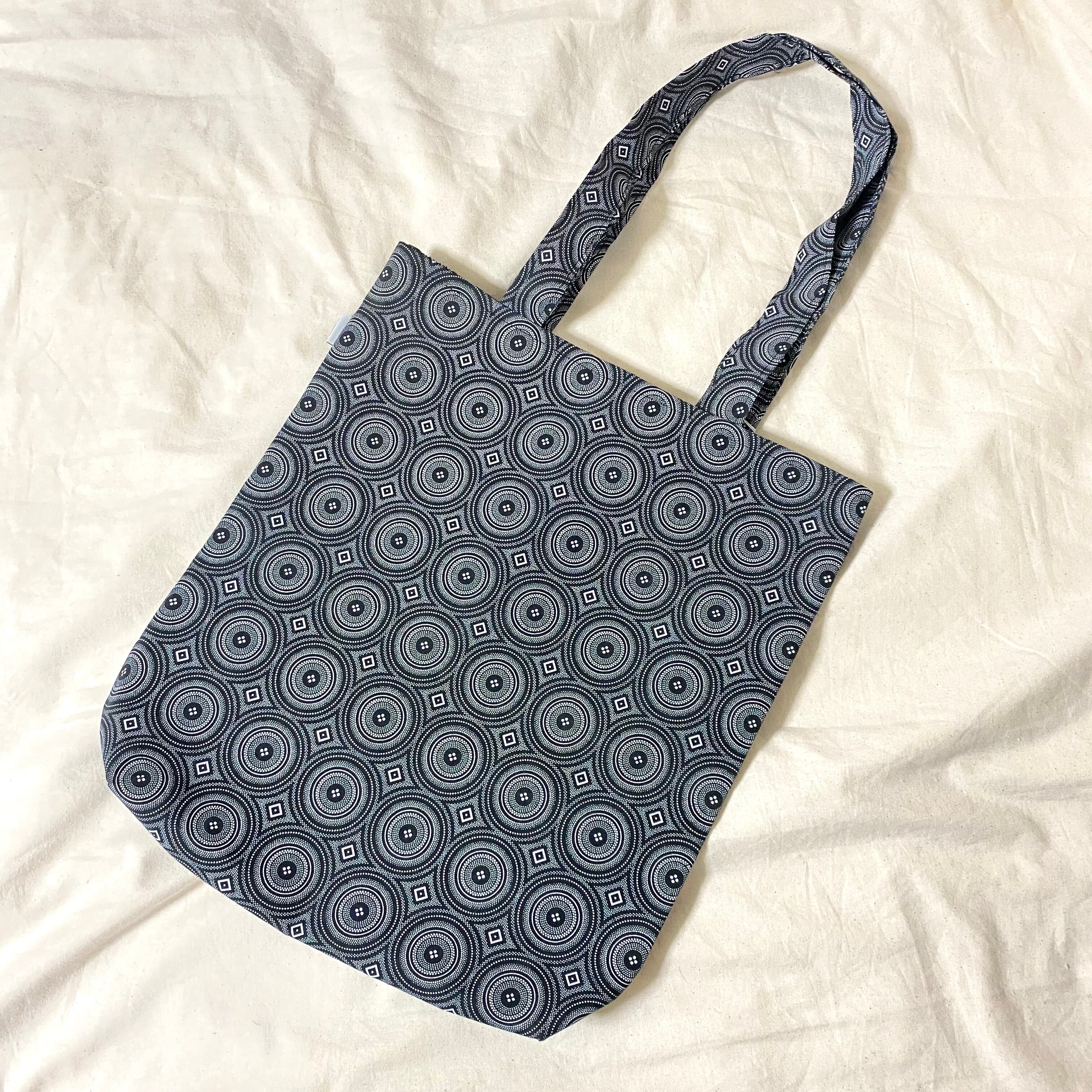 アフリカ布製のトートバッグです。バッグ部分はA4サイズが入る大きさ、持ち手部分は肩掛けできる長さで使い勝手の良い設計です。