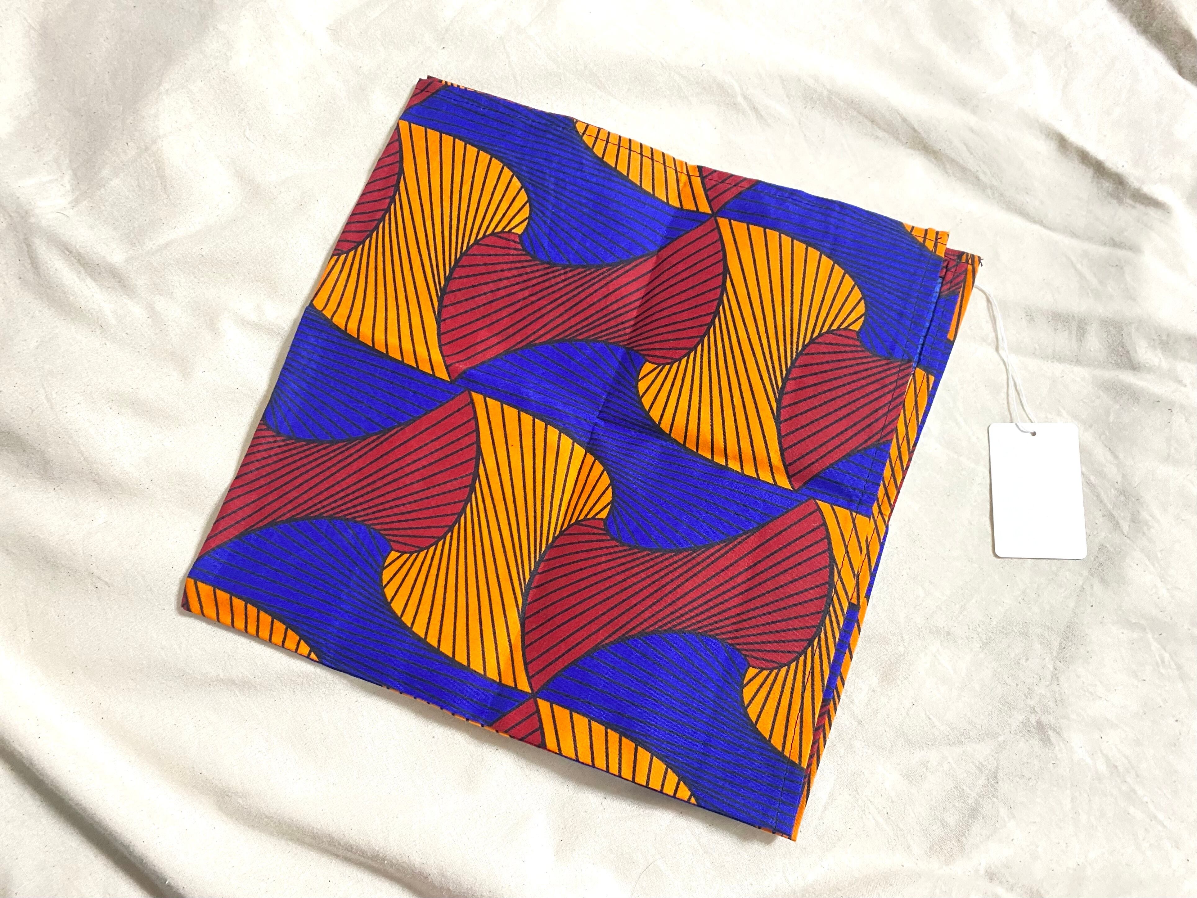 アフリカ布の美しさをそのまま楽しんでいただける大判ハンカチです。一辺約54cmとハンカチとしては大判サイズですので、バンダナとして使ったり小判のスカーフとして使ったりと様々な使い方がしていただけます。