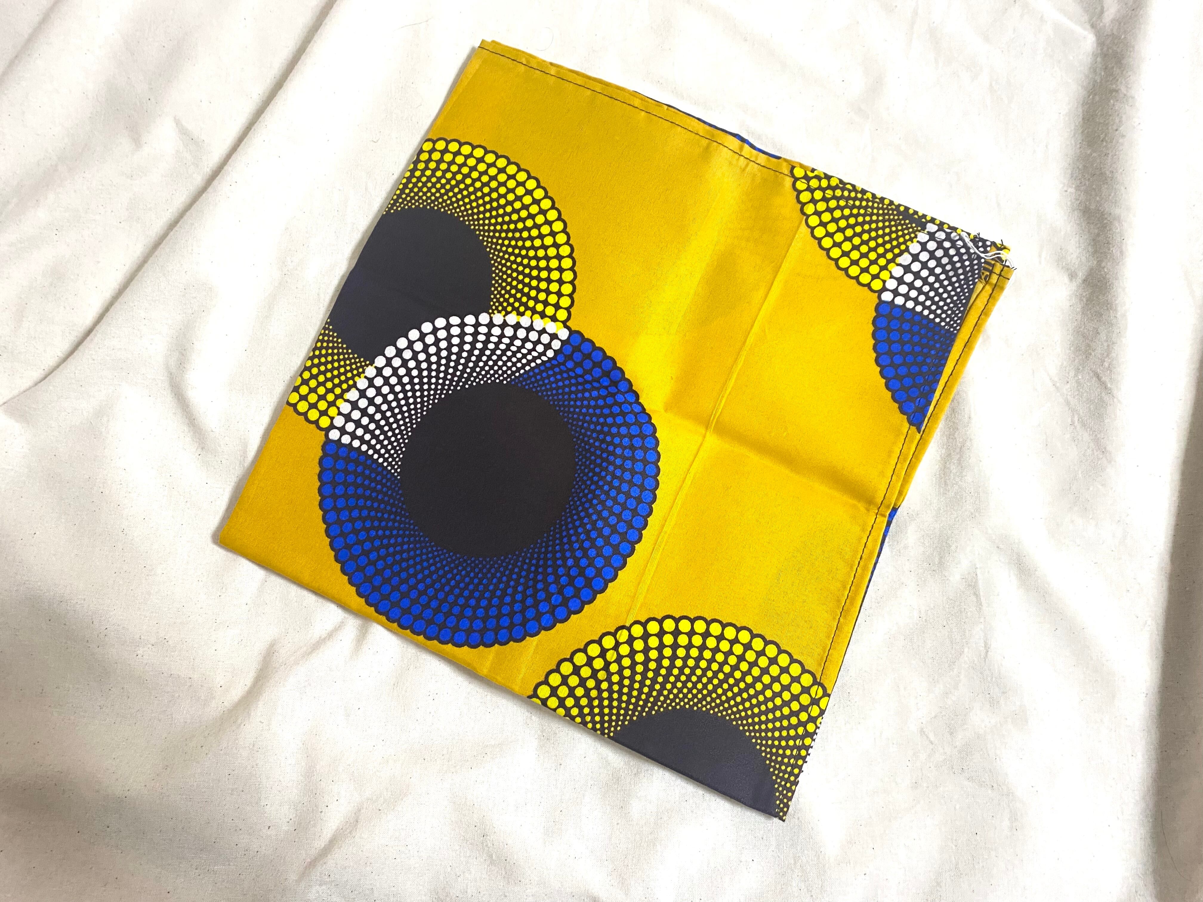 アフリカ布の美しさをそのまま楽しんでいただける大判ハンカチです。一辺約54cmとハンカチとしては大判サイズですので、バンダナとして使ったり小判のスカーフとして使ったりと様々な使い方がしていただけます。
